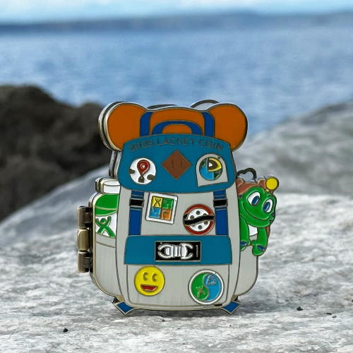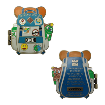 The 2025 Lackey coin is inspired by a sense of adventure! This backpack design opens up to reveal the pixel icons of the Geocaching HQ Lackeys who share the honor of serving the global geocaching community every day.