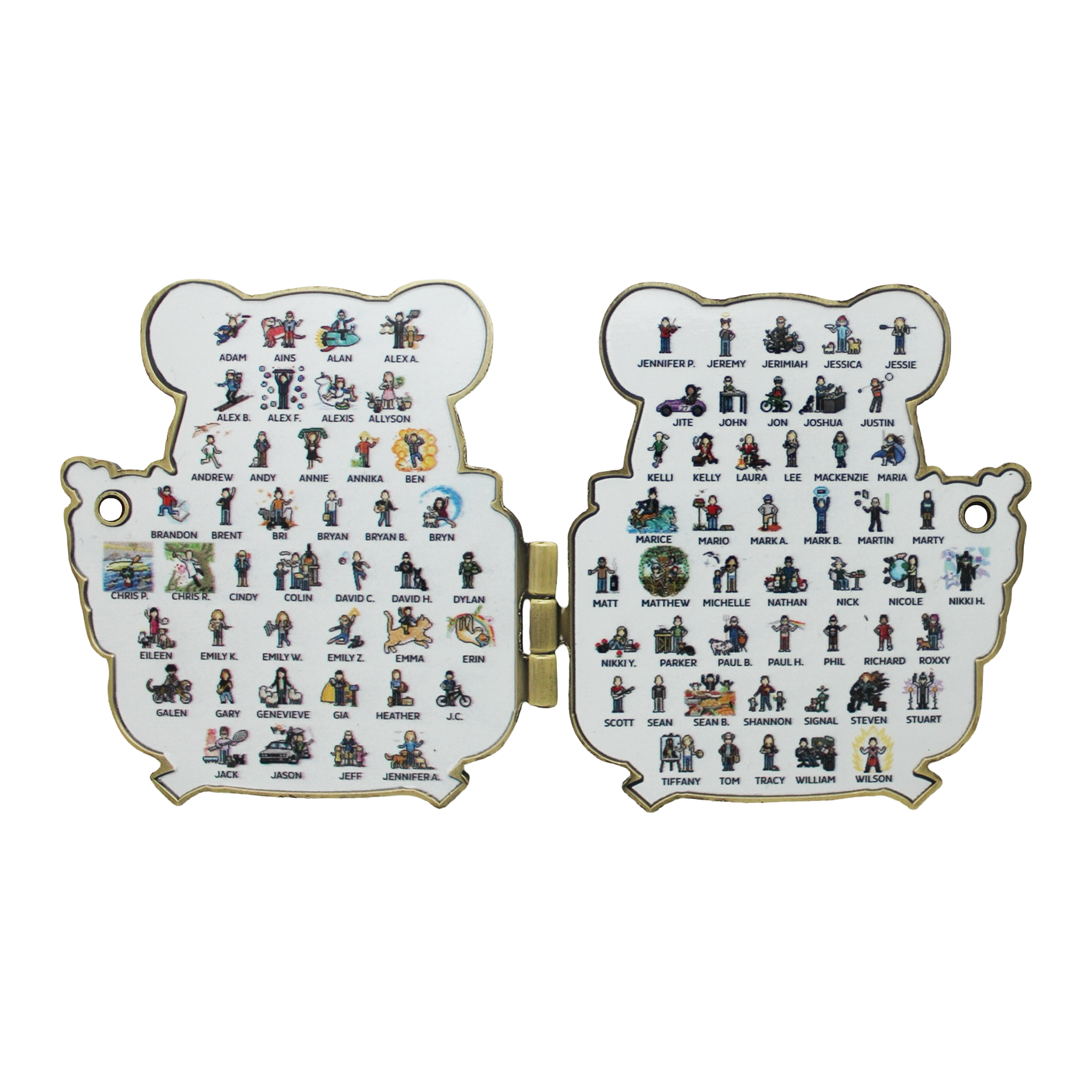 This is the 19th design of the Lackey coin. This is a large two paneled geocoin with a hinge to open like a book.