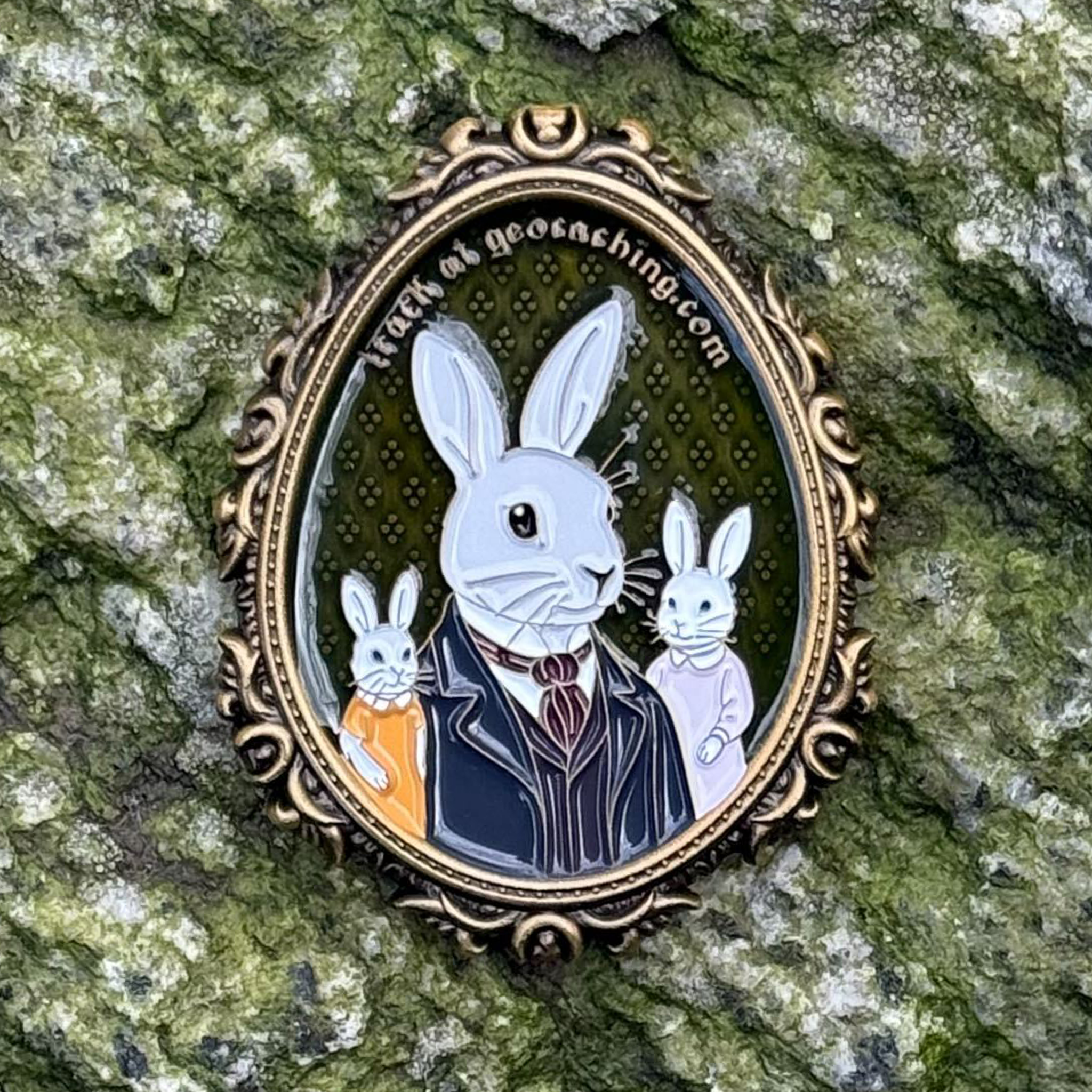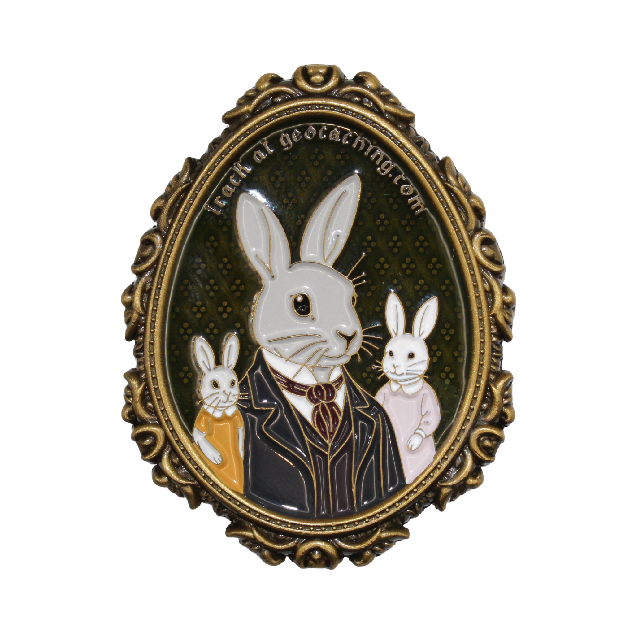 The 2026 Distinguished Rabbits Geocoin is trackable at Geocaching.com with a unique icon.